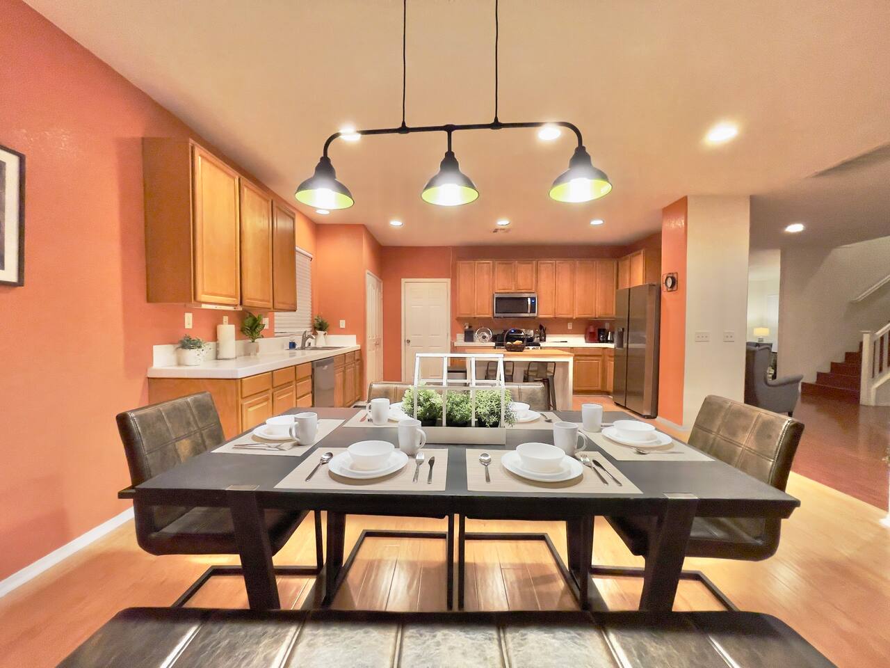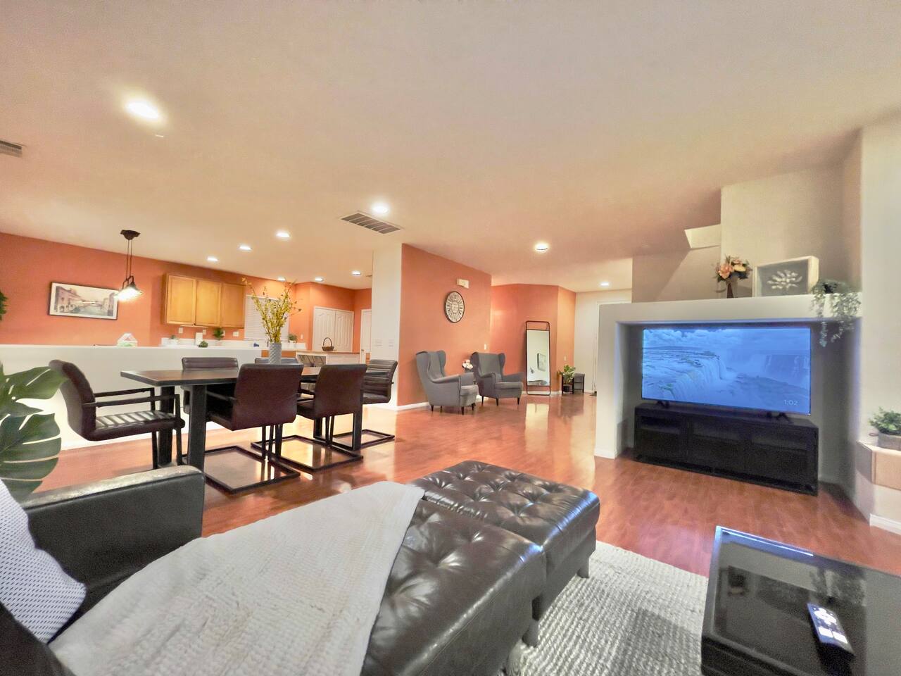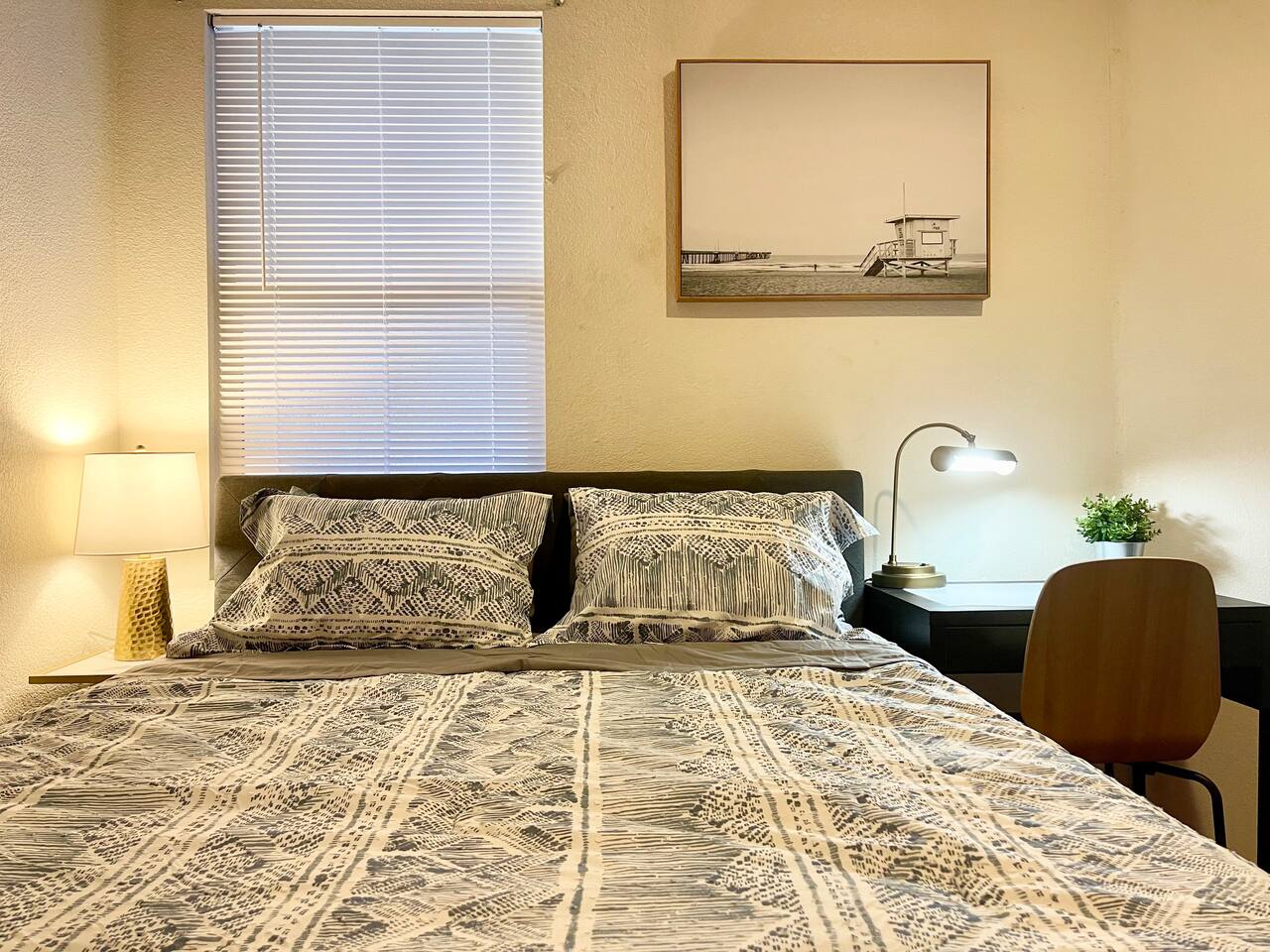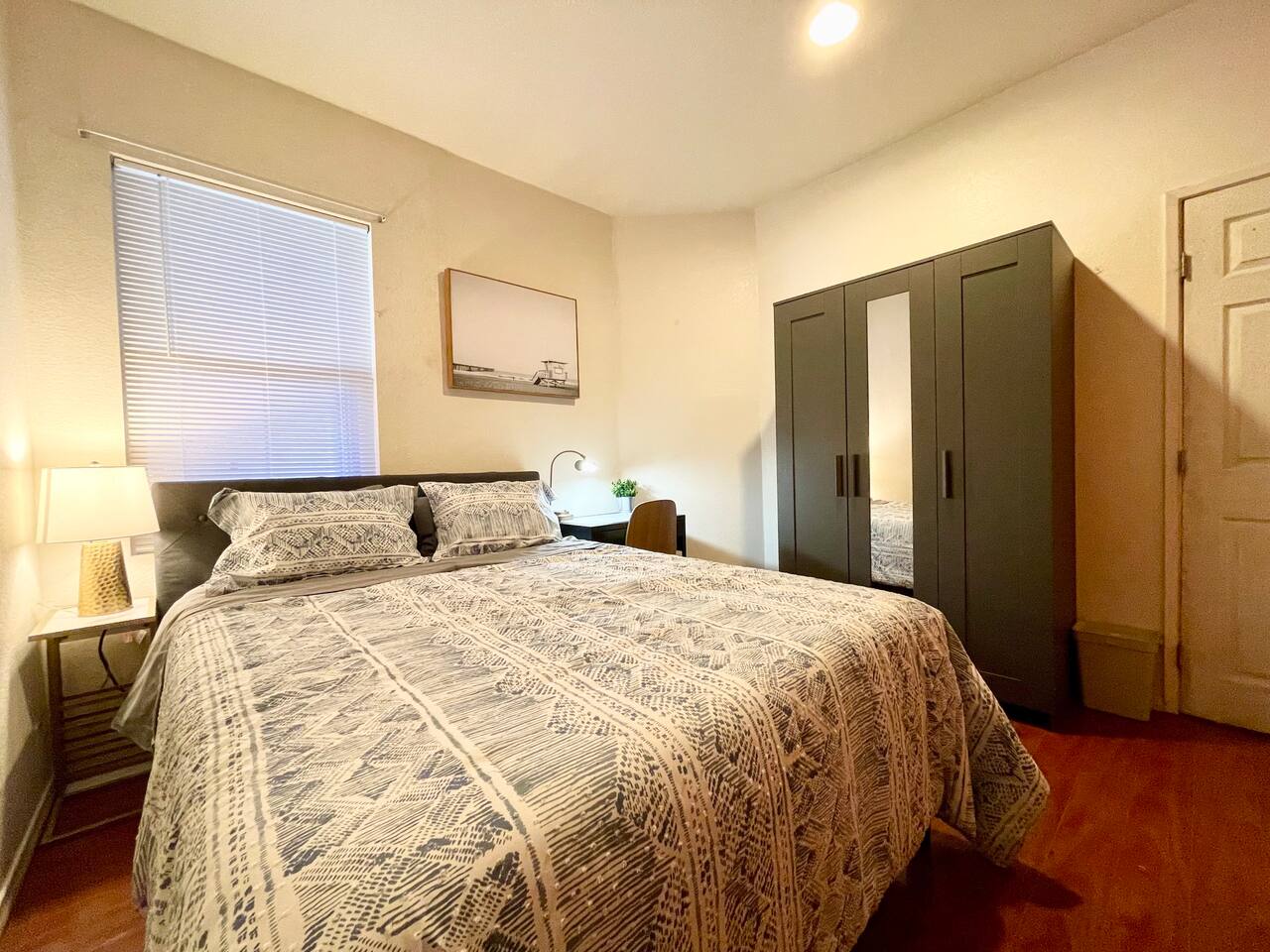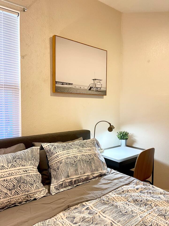 Enjoy a comfortable stay in a well-furnished, centrally located home with private rooms, modern amenities, high-speed Wi-Fi, shared spaces, and discounts for long-term guests. 🏠 Your Room ◉ Private bedroom with secure key lock ◉ 3 shared bathrooms (1 downstairs, 2 upstairs) ◉ Professionally cleaned with fresh linens and towels provided ◉ Central AC/heating set to maintain a comfortable 68-75°F ◉ Professional in-stay cleaning available upon request ($20 per clean) 🔑 Check-in & House Policies ◉ Convenient self check-in after 3 pm, with instructions sent 2 days prior ◉ Quiet hours from 10 pm to 8 am (earplugs recommended for light sleepers) ◉ Common space guidelines: respect quiet hours, clean up after yourself, keep your dry goods in your own assigned cabinet space, label any perishable food in the fridge with your name and date (expired items removed periodically) 📶 Connectivity & Entertainment ◉ 450+ Mbps high-speed Wi-Fi ◉ 4K smart TV and cozy fireplace in the living room ◉ Spectrum cable TV access via Spectrum streaming app 🍽️ Shared Spaces & Kitchen ◉ Fully stocked kitchen with new appliances and mid-century modern furnishings in common areas ◉ Bathrooms stocked with essentials: toilet paper, shower gel, shampoo, conditioner, and hairdryer ◉ Iron and ironing board available in the upstairs hallway closet 🚗 Outdoor & Parking ◉ Covered patio with dining and seating area surrounded by fig and plum trees ◉ Free parking on street and driveway (first come, first served) ◉ Ample parking available on Ave K 12 (no permit required); avoid parking in the cul-de-sac to ensure space for neighbors 💵 Discounts & Long-Term Stays ◉ Discounted rates available for long-term stays of one month or more
