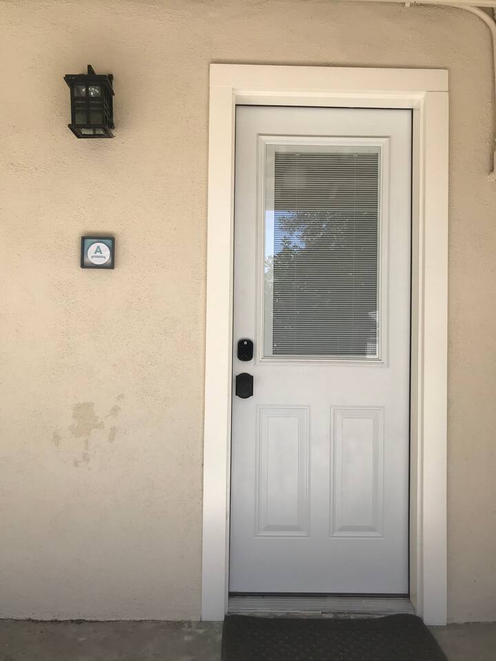 All guests will enter through the driveway. The guest suites are located under the porch, will have its own private entrance with digital key lock. To access the keypad, cover your lock to wake up the lock, enter the pin and press (the checkmark). Wait for the lock to retract, then enter the suite. Then close the door, and turn the knob to the left (it will automatically lock as well), so the door is locked. Please always check the lock of the door when you leave. To lock the door, press any key on the keypad, you will hear the lock engage. The door is locked.