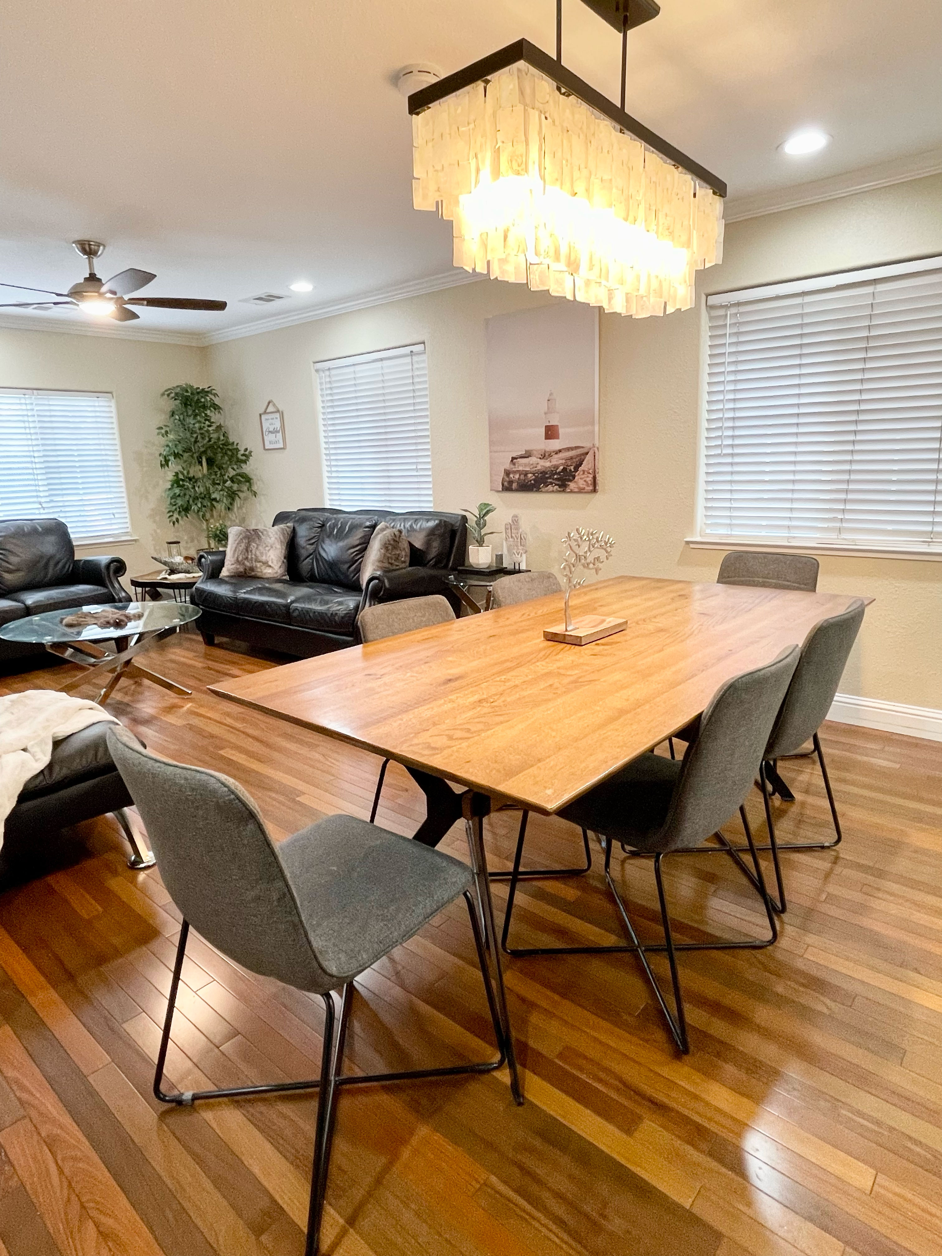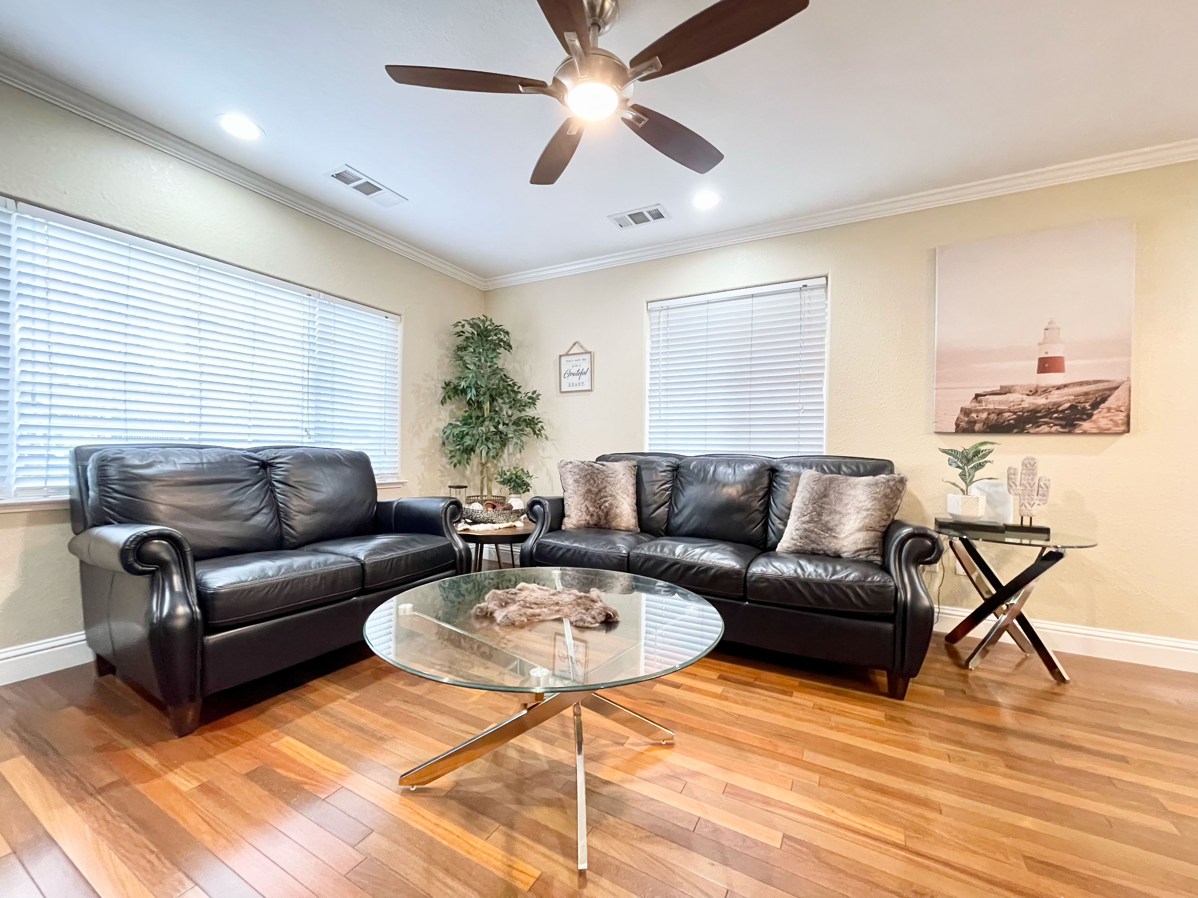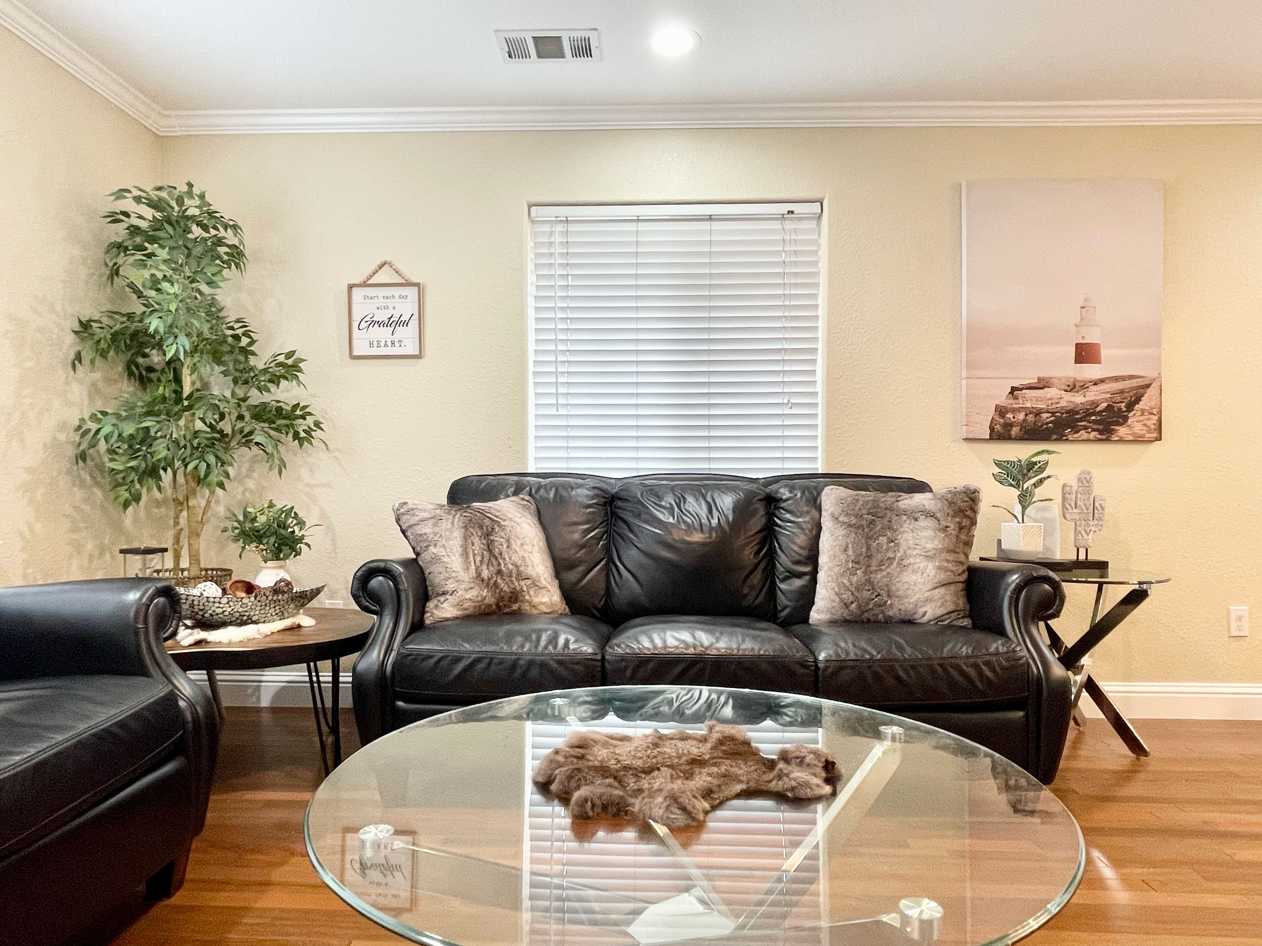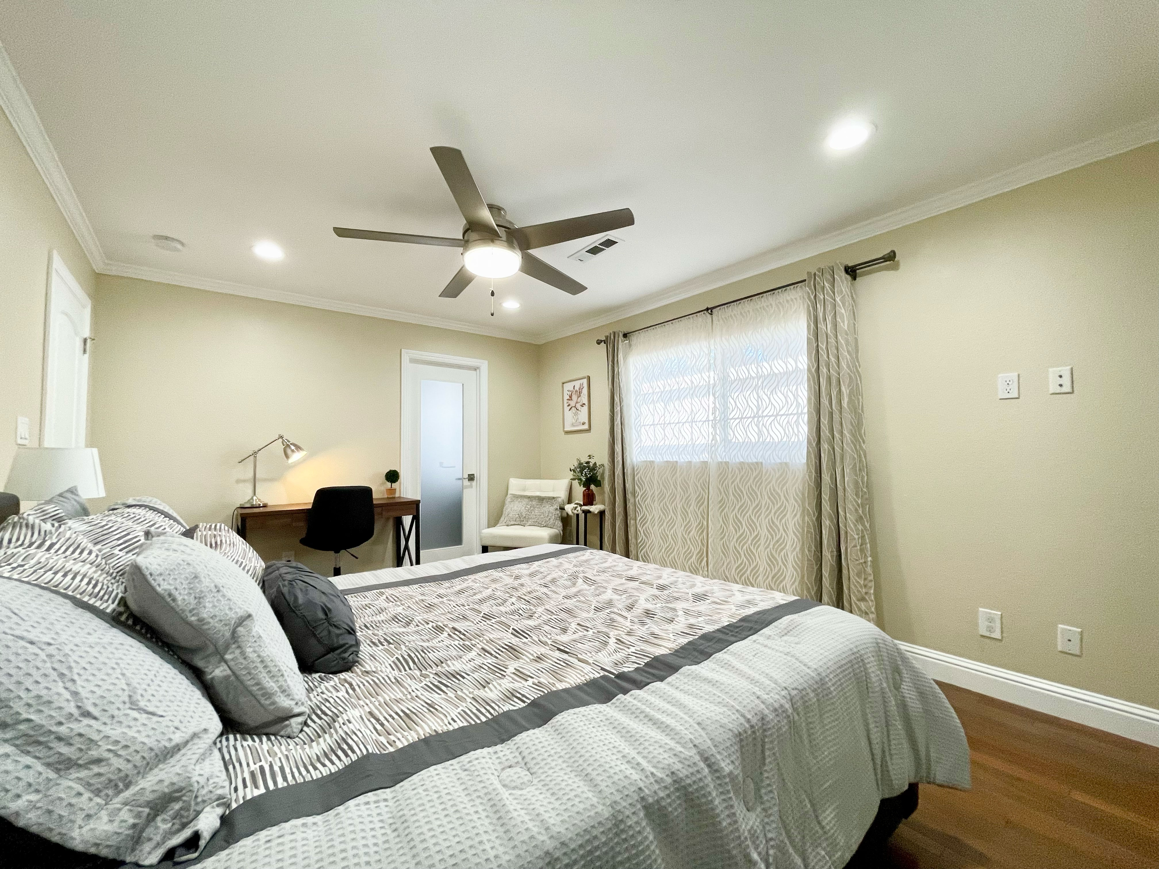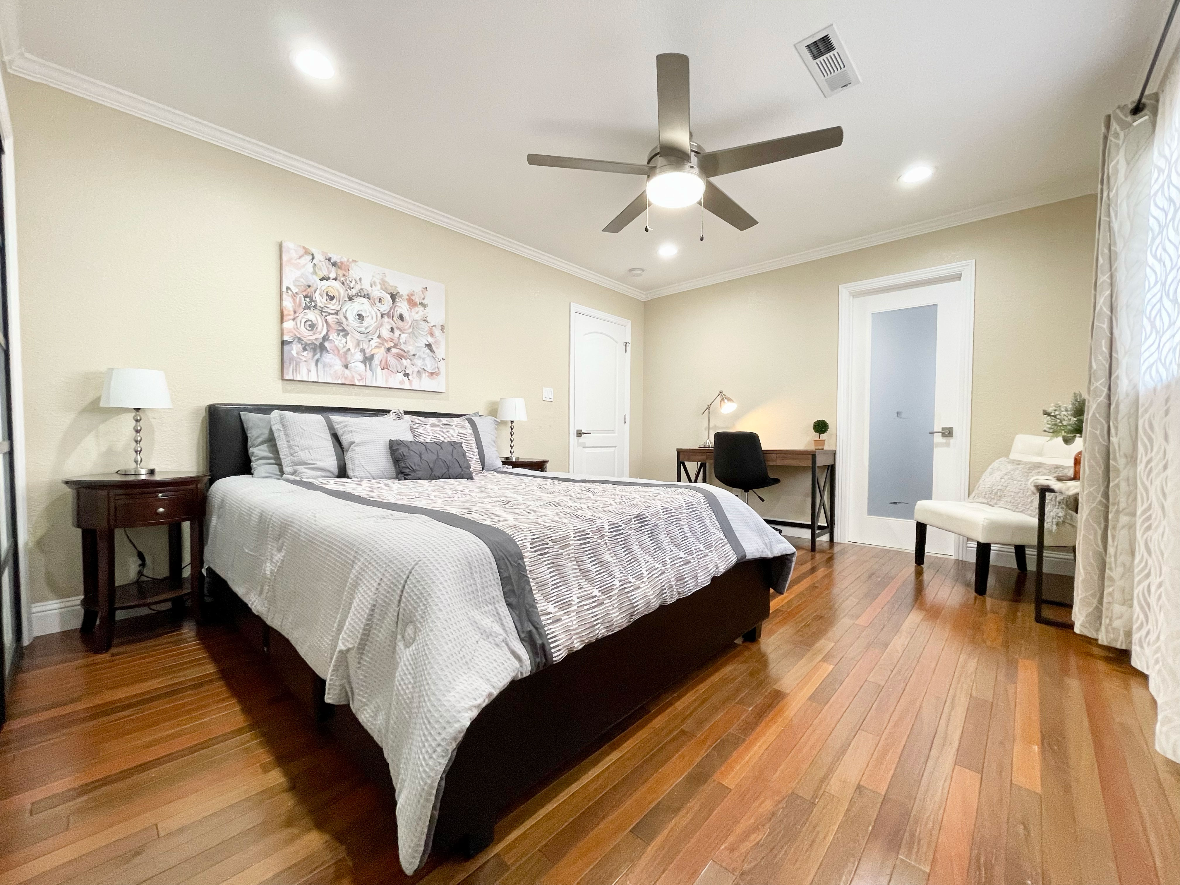 🏡 Elegant & Fully Equipped Living Spaces • Gourmet Kitchen – Fully stocked with premium KitchenAid appliances for all your cooking needs. • Stylish Dining Area – Gather around the elegant dining table under a stunning shell chandelier. • Cozy Living Room – Relax on a genuine leather sofa and enjoy movie nights on a 65” Smart TV with a high-quality soundbar. • Dedicated workspace – perfect for remote work. 🛏️ Luxury Bedrooms & Sleeping Arrangements • Master Bedroom Retreat: • Queen bed with a top-of-the-line Tempurpedic mattress for restful sleep. • Cozy accent chair – ideal for bedtime reading. • Ensuite bath with a luxurious wall-to-wall tile shower. • His & her closets with custom built-in storage. 🛌 Additional Sleeping Options: • Queen-size Sealy air mattress for extra guests. • Sleeping Cot for additional flexibility. 🌞 Outdoor & Extra Amenities • 🏡 Private Fenced Front Yard – Enjoy the California sun in a safe space for kids and pets. • 🚗 Dedicated Parking – Private driveway parking for your convenience. • 📶 High-Speed WiFi – Business-class Internet (~120 Mbps) for seamless work or streaming. • ☕ Flexbrew Coffee Station – A perfect productivity boost for your mornings. • 💧 Whole-House Premium Water Filtration – Fresh, drinkable water from any tap. • ❄️ Central AC & Heating – Stay comfortable year-round. 🔑 Seamless Check-in & Security • Self Check-in – A unique virtual key will be generated for your stay, valid from 3:00 PM check-in to 11:00 AM check-out. 🔒 Safety & Guest Policy: • 24/7 video surveillance for security. • Keep all doors locked at all times. • List the correct number of guests in your reservation. • Notify us via the Airbnb app if you expect any visitors. • Unregistered visitors are not allowed and will be considered trespassing.