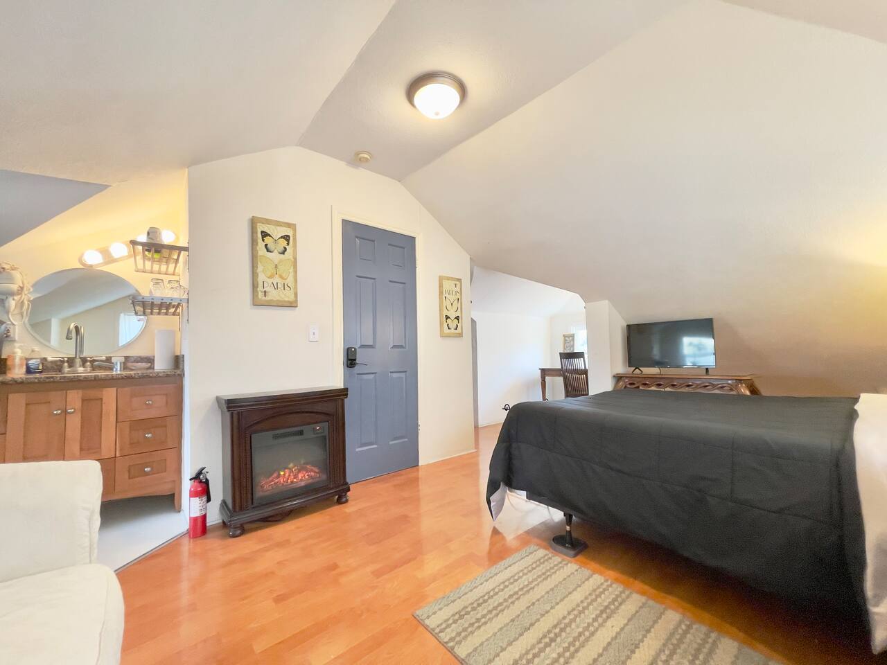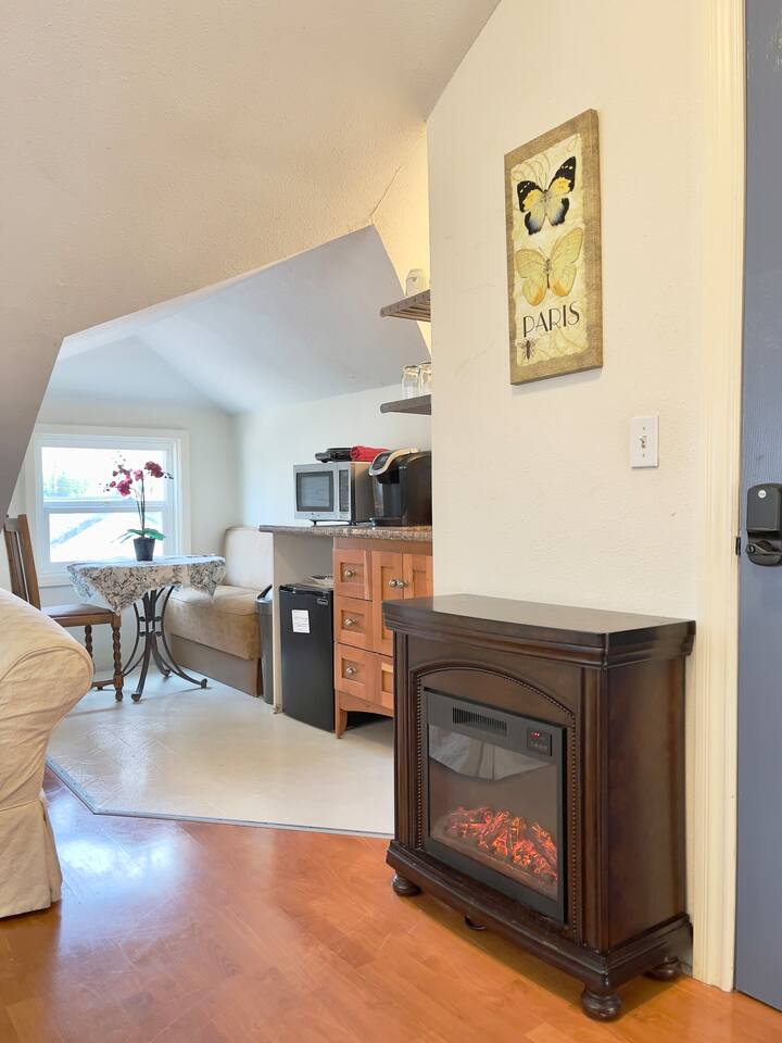 The Space Your spacious suite (approximately 300 sq ft) is designed for your utmost comfort and privacy. It features a comfortable queen bed and floor bed, making it ideal for families, friends, or business travelers. The suite also includes a dedicated office space, perfect for remote work or studying. Stay Connected Stay connected with high-speed mesh WiFi and enjoy entertainment on the smart TV. On chilly evenings, cozy up by the electric fireplace or unwind on the comfortable couches. Kitchenette Prepare your meals in the fully stocked kitchenette, equipped with all the essentials you need for an extended stay. Enjoy your meals at the built-in dinette. Shared Bathroom The full bathroom is shared with another suite on the opposite side of the house. Rest assured, it will be professionally cleaned before each stay and stocked with clean linens and toiletries. Easy Check-In You can conveniently self-check-in with a unique virtual key. Just confirm your reservation and check-in instructions beforehand. The virtual key is valid from 4:00 pm on your check-in date until 12:00 am on your check-out date. Please ensure you check in to the correct room number and lock your room securely. Safety & Security Your safety is our priority. Please keep the doors locked at all times, and note that the property is equipped with 24/7 video surveillance. To maintain a safe and secure environment for all guests, please inform us in advance of any additional visitors through the Airbnb app. Unsolicited Visitors For the safety and comfort of all our guests, please let us know the correct number of guests who will be staying or let us know if you have visitors. Any unsolicited visitors will be considered trespassing. Whether you're here for business, leisure, or a bit of both, the Hull House provides a welcoming and secure place to call home during your stay in Silicon Valley. Book your stay today and experience the charm and convenience of our Victorian loft suite. We look forward to hosting you!