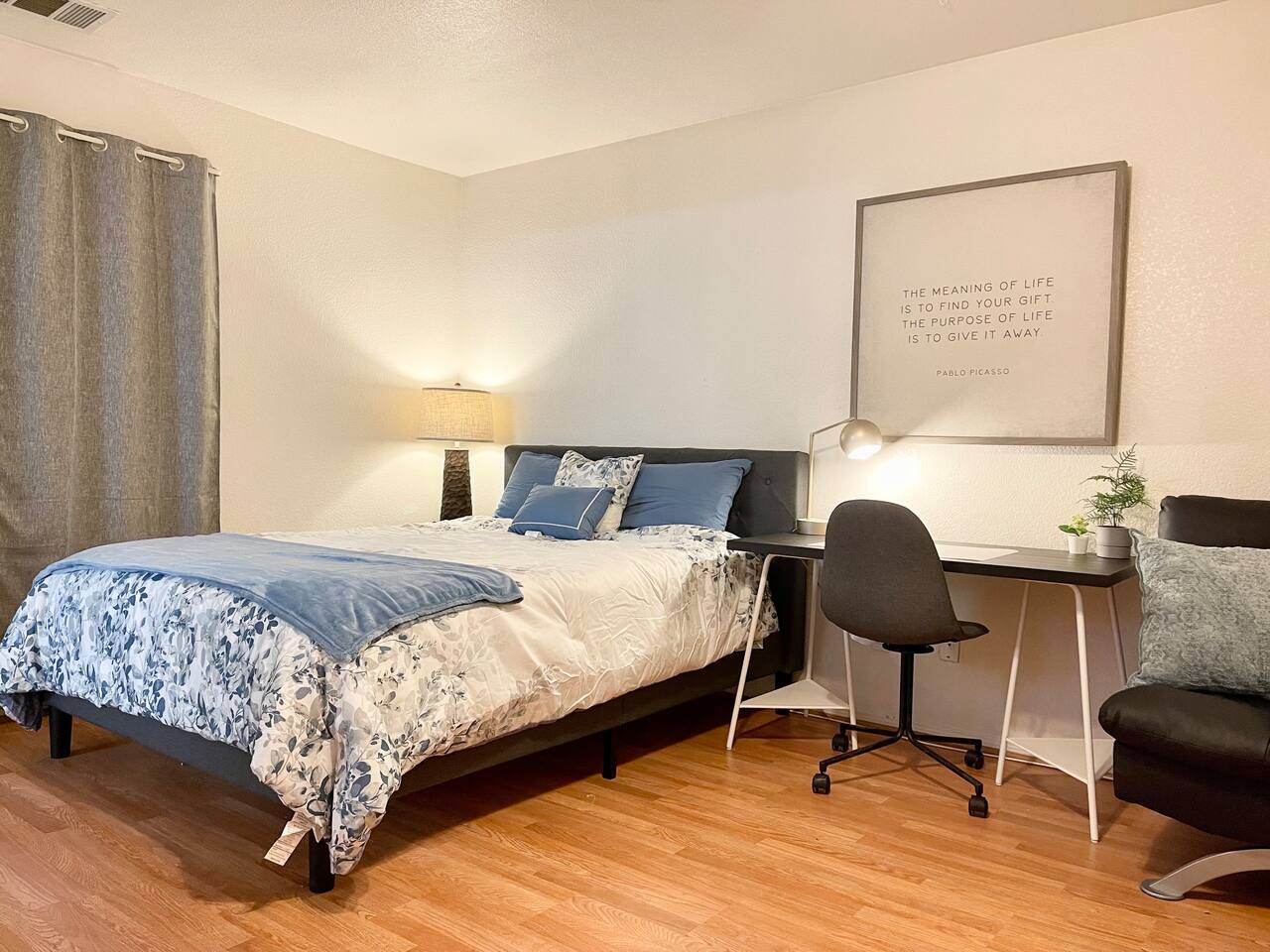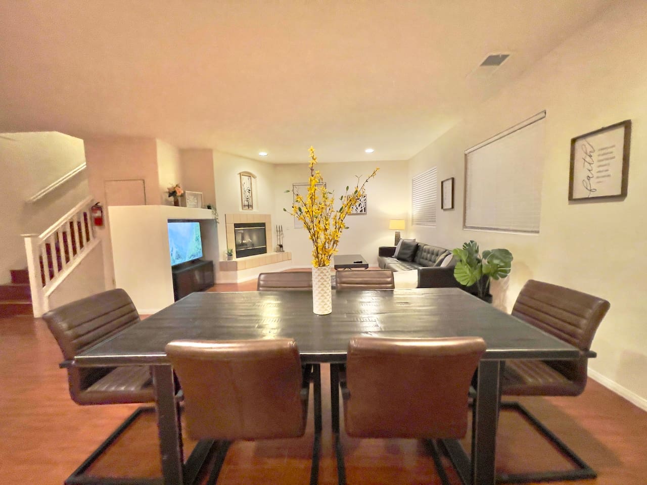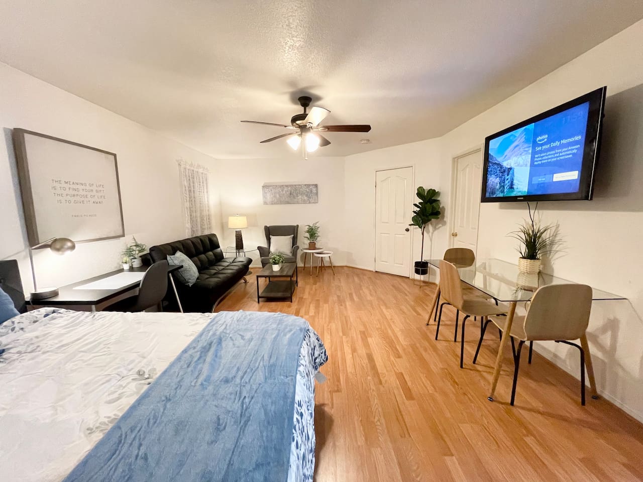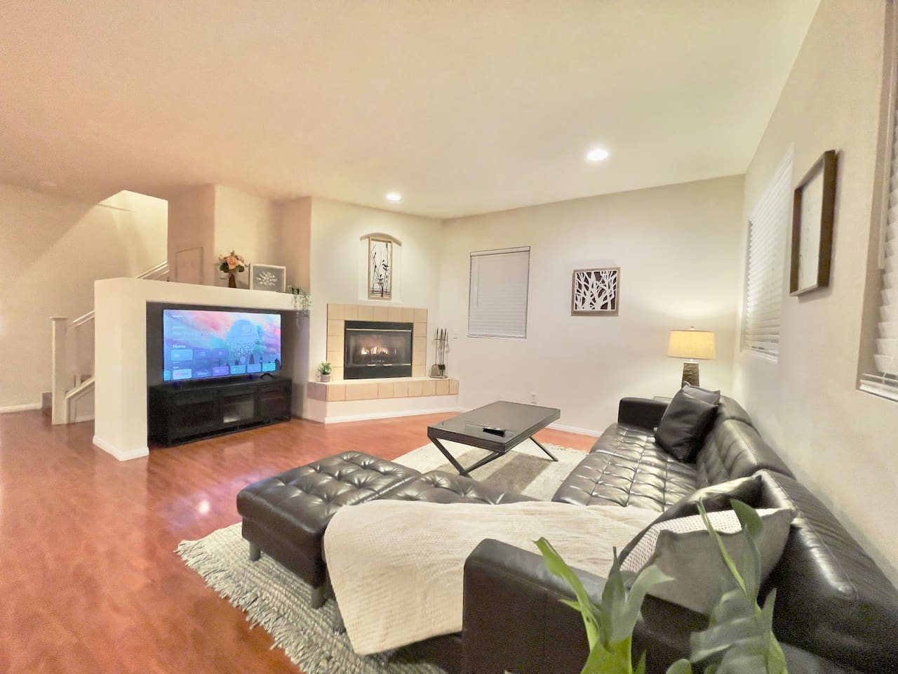 Enjoy a comfortable stay in a well-furnished, centrally located home with private rooms, modern amenities, high-speed Wi-Fi, shared spaces, and discounts for long-term guests. 🏠 Your Room ◉ Spacious master bedroom (600+ sf) with secure key lock ◉ Private living room, dinning room, large walk-in closet in suite ◉ Ensuite bathroom with separate, toilet and shower ◉ Professionally cleaned with fresh linens and towels provided ◉ Central AC/heating set to maintain a comfortable 68-75°F ◉ Professional in-stay cleaning available upon request ($20 per clean) 🔑 Check-in & House Policies ◉ Convenient self check-in after 3 pm, with instructions sent 2 days prior ◉ Quiet hours from 10 pm to 8 am (earplugs recommended for light sleepers) ◉ Common space guidelines: respect quiet hours, clean up after yourself, keep your dry goods in your own assigned cabinet space, label any perishable food in the fridge with your name and date (expired items removed periodically) 📶 Connectivity & Entertainment ◉ 450+ Mbps high-speed Wi-Fi ◉ 4K smart TV and cozy fireplace in the living room ◉ Spectrum cable TV access via Spectrum streaming app 🍽️ Shared Spaces & Kitchen ◉ Fully stocked kitchen with new appliances and mid-century modern furnishings in common areas ◉ Bathrooms stocked with essentials: toilet paper, shower gel, shampoo, conditioner, and hairdryer ◉ Iron and ironing board available in the upstairs hallway closet 🚗 Outdoor & Parking ◉ Covered patio with dining and seating area surrounded by fig and plum trees ◉ Free parking on street and driveway (first come, first served) ◉ Ample parking available on Ave K 12 (no permit required); avoid parking in the cul-de-sac to ensure space for neighbors 💵 Discounts & Long-Term Stays ◉ Discounted rates available for long-term stays of one month or more