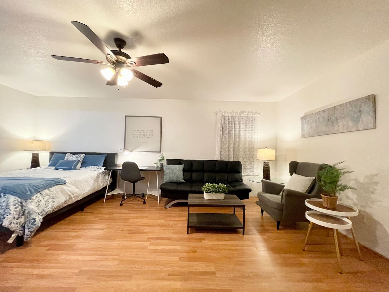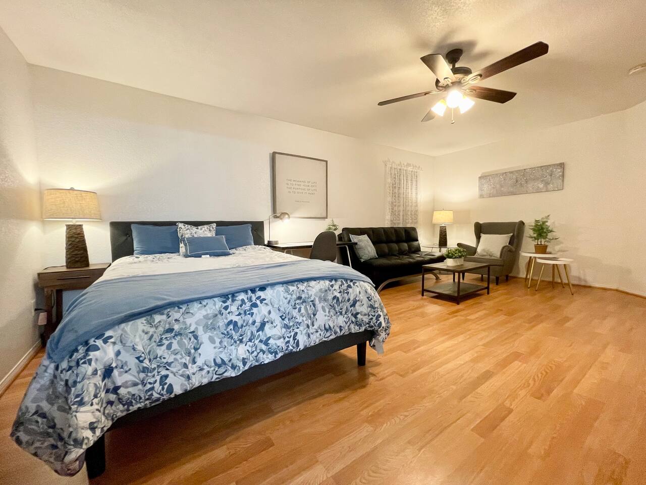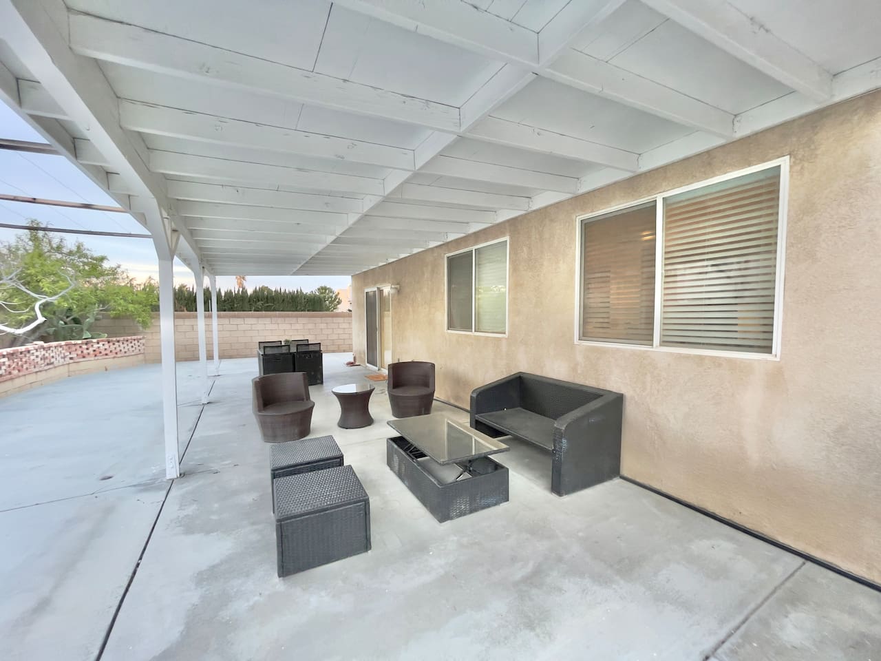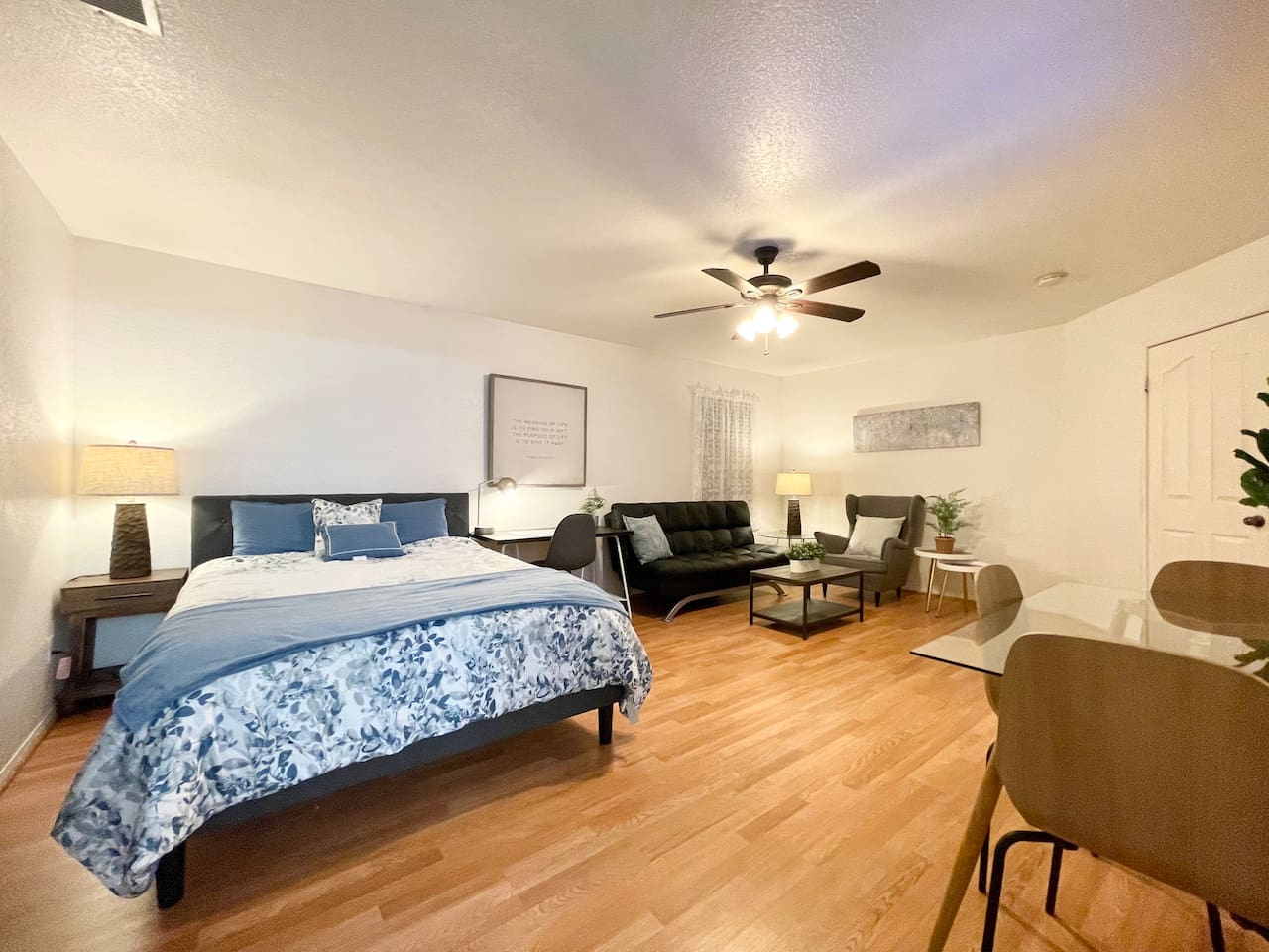 Enjoy a comfortable stay in a well-furnished, centrally located home with private rooms, modern amenities, high-speed Wi-Fi, shared spaces, and discounts for long-term guests. 🏠 Your Room ◉ Spacious master bedroom (600+ sf) with secure key lock ◉ Private living room, dinning room, large walk-in closet in suite ◉ Ensuite bathroom with separate, toilet and shower ◉ Professionally cleaned with fresh linens and towels provided ◉ Central AC/heating set to maintain a comfortable 68-75°F ◉ Professional in-stay cleaning available upon request ($20 per clean) 🔑 Check-in & House Policies ◉ Convenient self check-in after 3 pm, with instructions sent 2 days prior ◉ Quiet hours from 10 pm to 8 am (earplugs recommended for light sleepers) ◉ Common space guidelines: respect quiet hours, clean up after yourself, keep your dry goods in your own assigned cabinet space, label any perishable food in the fridge with your name and date (expired items removed periodically) 📶 Connectivity & Entertainment ◉ 450+ Mbps high-speed Wi-Fi ◉ 4K smart TV and cozy fireplace in the living room ◉ Spectrum cable TV access via Spectrum streaming app 🍽️ Shared Spaces & Kitchen ◉ Fully stocked kitchen with new appliances and mid-century modern furnishings in common areas ◉ Bathrooms stocked with essentials: toilet paper, shower gel, shampoo, conditioner, and hairdryer ◉ Iron and ironing board available in the upstairs hallway closet 🚗 Outdoor & Parking ◉ Covered patio with dining and seating area surrounded by fig and plum trees ◉ Free parking on street and driveway (first come, first served) ◉ Ample parking available on Ave K 12 (no permit required); avoid parking in the cul-de-sac to ensure space for neighbors 💵 Discounts & Long-Term Stays ◉ Discounted rates available for long-term stays of one month or more