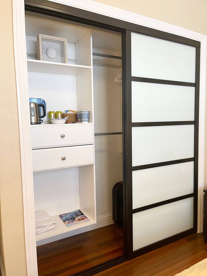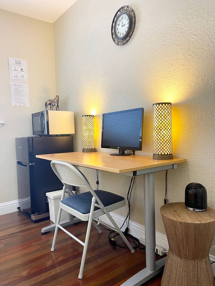 All private room guests will access it through the backdoor of the house through digital key lock. To unlock the door, cover the keypad to wake up the lock, enter the pin and press (the checkmark). Wait for the lock to retract, then enter the home. Then close the door, and turn the knob to the left, so the door is locked. Please always lock the door when you leave. To lock the door, press any key on the keypad, you will hear the lock engage. The door is locked. To check out, leave the room key on the desk (don't lock the room), and lock the exterior door on your way out. At this time we do not allow access to the kitchen, but please feel free to get water from the sink (water filter & electric kettle are included in the room).