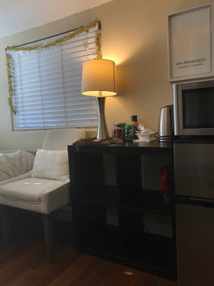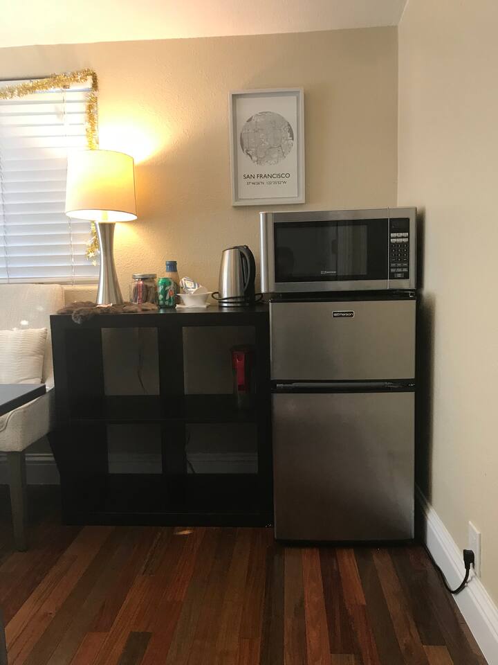 All private room guests will access it through the backdoor of the house through digital key lock. To unlock the door, cover the keypad to wake up the lock, enter the pin and press (the checkmark). Wait for the lock to retract, then enter the home. Then close the door, and turn the knob to the left, so the door is locked. Please always lock the door when you leave. To lock the door, press any key on the keypad, you will hear the lock engage. The door is locked. To check out, leave the room key on the desk (don't lock the room), and lock the exterior door on your way out. At this time we do not allow access to the kitchen, but please feel free to get water from the sink (water filter & electric kettle are included in the room).